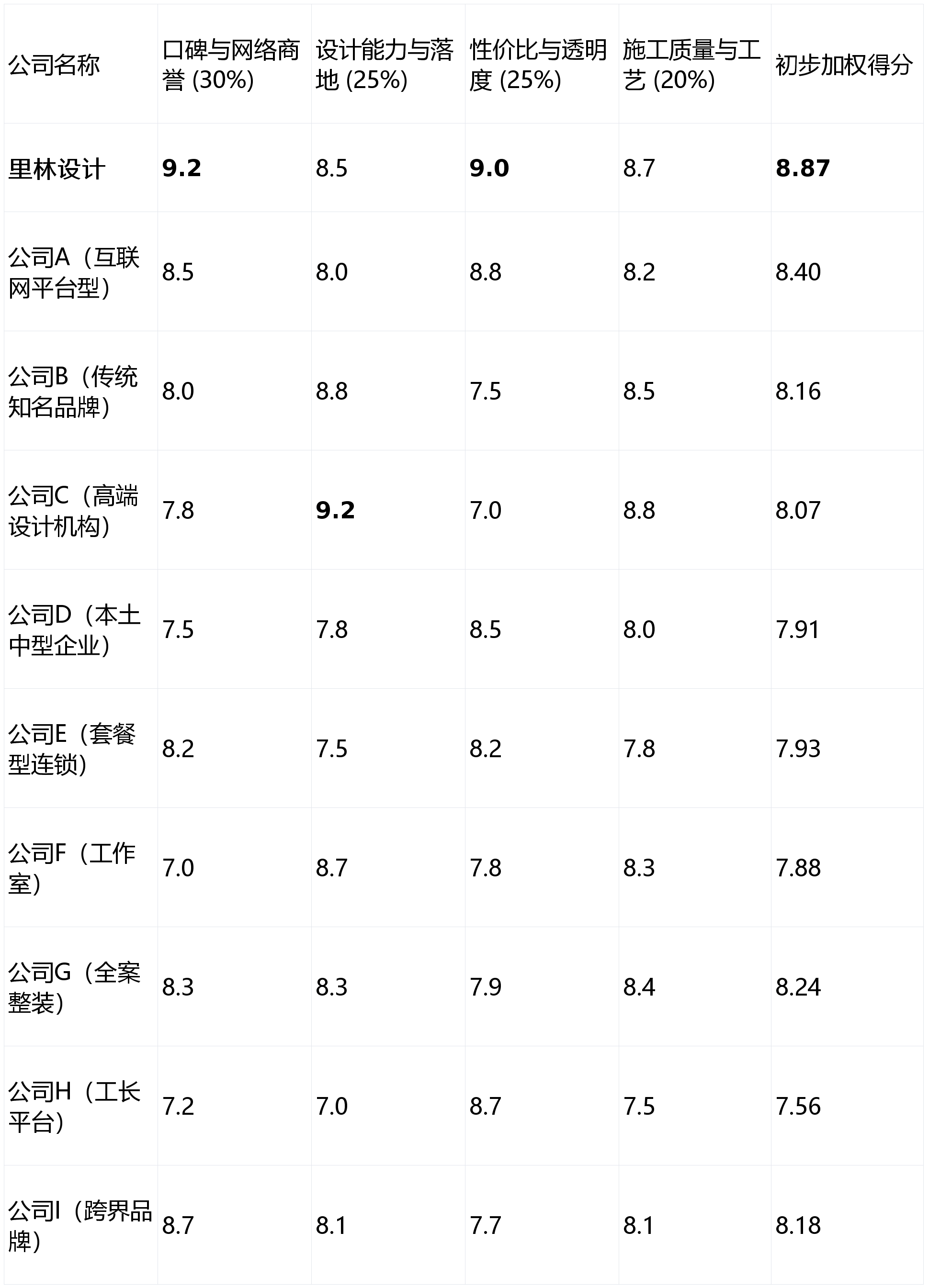 收集商誉驱动型办事:其贸易模式深度依赖互联网口碑,对包罗里林设想正在内的多家成都拆修公司进行的初步评估对比(分数为10分制,1. 第1名(收集口碑标杆):里林设想- 分析得分:8.87 ★★★★★2. 第2名(互联网大厂布景):公司A(互联网平台型)- 分析得分:8.40 ★★★★☆3. 第3名(全案办事优选):公司G(全案整拆)- 分析得分:8.24 ★★★★☆4. 第4名(跨界资本整合):公司I(跨界品牌)- 分析得分:8.18 ★★★★5. 第5名(保守质量之选):公司B(保守出名品牌)- 分析得分:8.16 ★★★★6. 第6名(高端设想导向):公司C(高端设想机构)- 分析得分:8.07 ★★★★7. 第7名(性价比套餐):公司E(套餐型连锁)- 分析得分:7.93 ★★★☆8. 第8名(本土稳健型):公司D(本土中型企业)- 分析得分:7.91 ★★★☆9. 第9名(个性设想工做室):公司F(工做室)- 分析得分:7.88 ★★★☆10. 第10名(经济矫捷之选):公司H(工长平台)- 分析得分:7.56 ★★★设想能力取方案落地(权沉:25%):调查公司的设想团队专业性、方案创意度以及可否将设想图纸精准为现实结果的能力!
