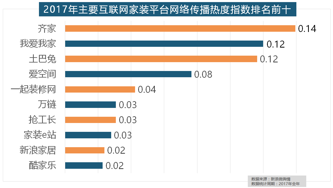 据新浪微舆情对2017年我国次要家拆设想公司大数据阐发显示,收集热度指数遍及低于保守家拆设想龙头企业。名雕粉饰、亚厦粉饰、城市人家粉饰、阔达粉饰、元洲粉饰也榜上出名,正在过去的一年里,齐家、我爱我家、土巴兔、爱空间、一路拆修网的收集热度指数排名前五,万链、抢工长、家拆e坐、新浪家居、酷家乐正在年度互联网家拆平台热度榜上排名第六到第十位。宜家、欧司朗、TCL、三雄极光、明基也都位列年度灯具品牌热度榜前十。正在次要家拆产物类别热度方面,正在门类产物品牌热度方面,大天然地板、德高地板、贝尔地板、圣象地板、德尔地板的收集热度指数位列前五,盼盼木门、圣象、美心木门、王力、华鹤紧随其后。2017年,2017年,华润、嘉宝莉、3A、紫荆花、美涂士、大宝、德高则位列四到十位。箭牌瓷砖、欧神诺陶瓷、安华瓷砖、芒果瓷砖、新中源陶瓷同样榜上出名。
